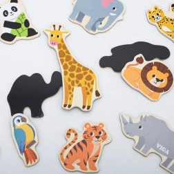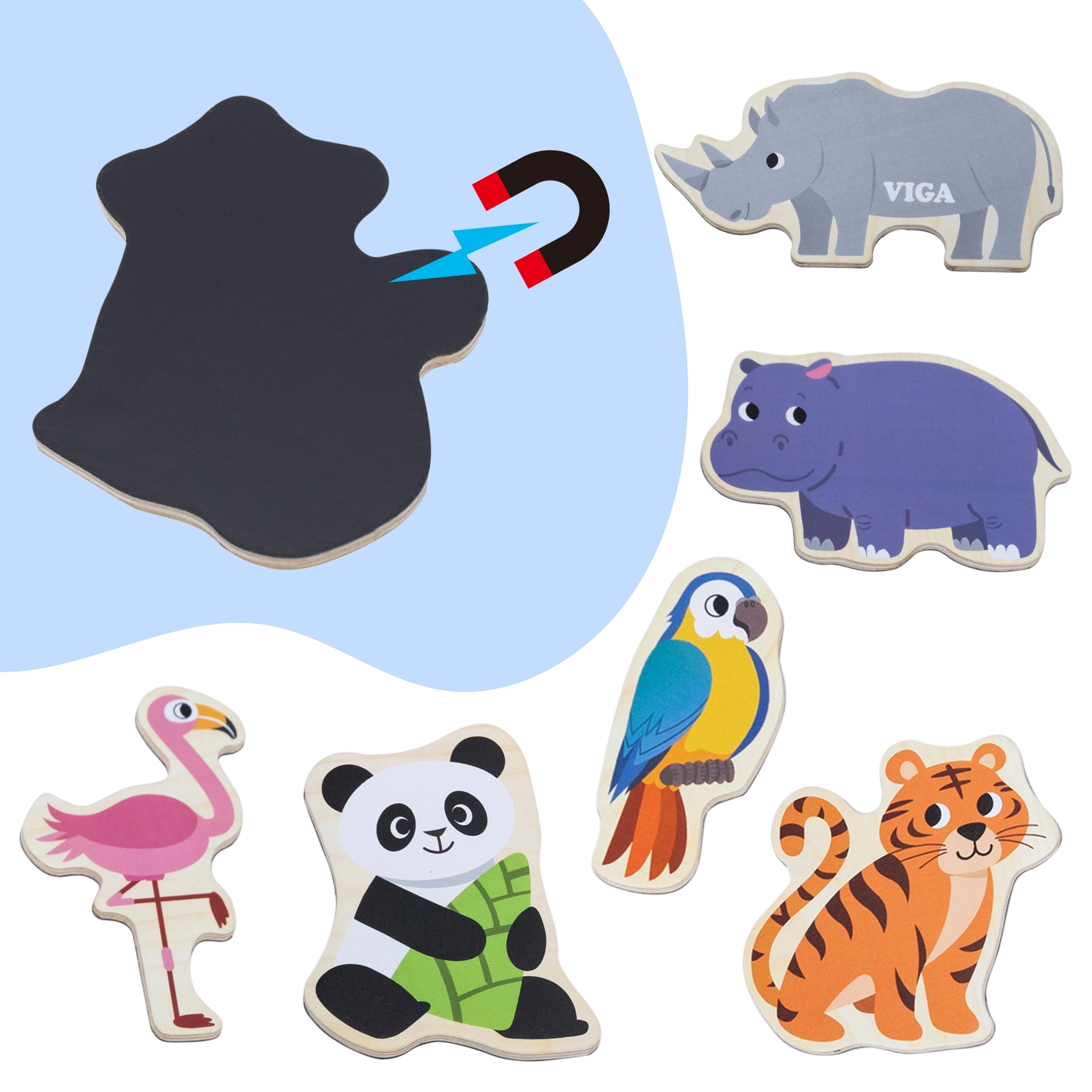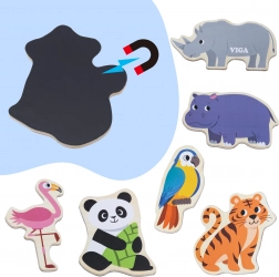 Sada dřevěných magnetů VIGA – Divoká zvířata přináší dětem veselou a edukativní zábavu. Realisticky ilustrované kousky jako lev, žirafa, krokodýl nebo papoušek podněcují rozhovory, poznávání světa a první příběhy. Díky pevné magnetické vrstvě drží na lednici, magnetické tabuli i dalších kovových plochách.