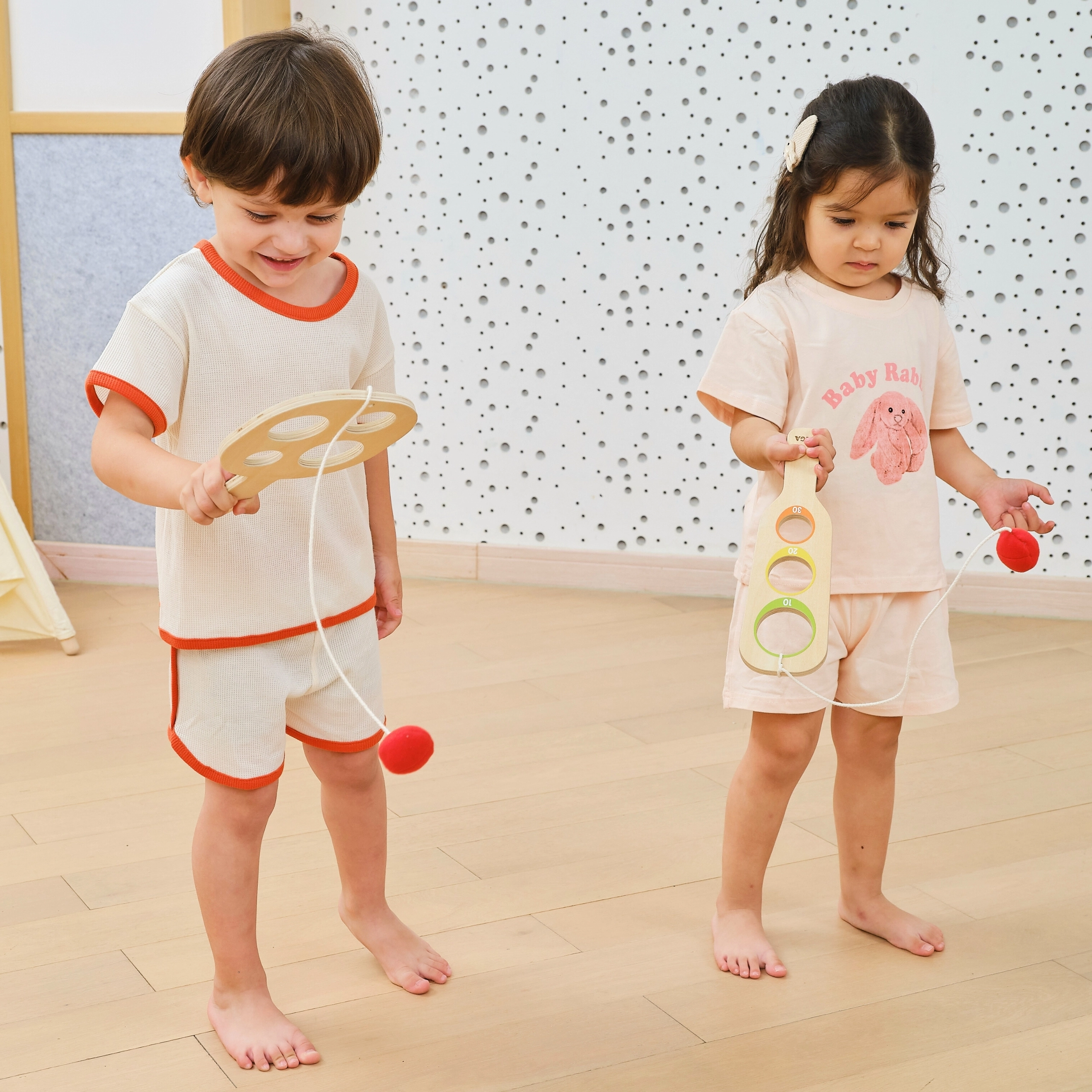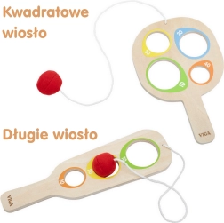Objevte chytlavou dovednostní hru, která děti motivuje k pohybu i soustředění. Dvě dřevěné paletky – jedna delší, druhá kompaktnější – mají více kruhových otvorů s bodováním (10–50). Cílem je švihem dostat měkký míček na šňůrce skrz co nejmenší otvor a získat tak více bodů. Skvělé pro samostatnou hru i přátelské mini turnaje.