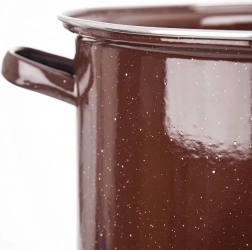 Tento prostorný smaltovaný hrnec v retro stylu kombinuje klasický design s moderní funkčností. Vyroben je z kvalitní smaltované oceli v hnědé barvě s jemným béžovým kropením. Smalt je zdraví bezpečný a vhodný i pro alergiky, neovlivňuje chuť pokrmů a snadno se udržuje.