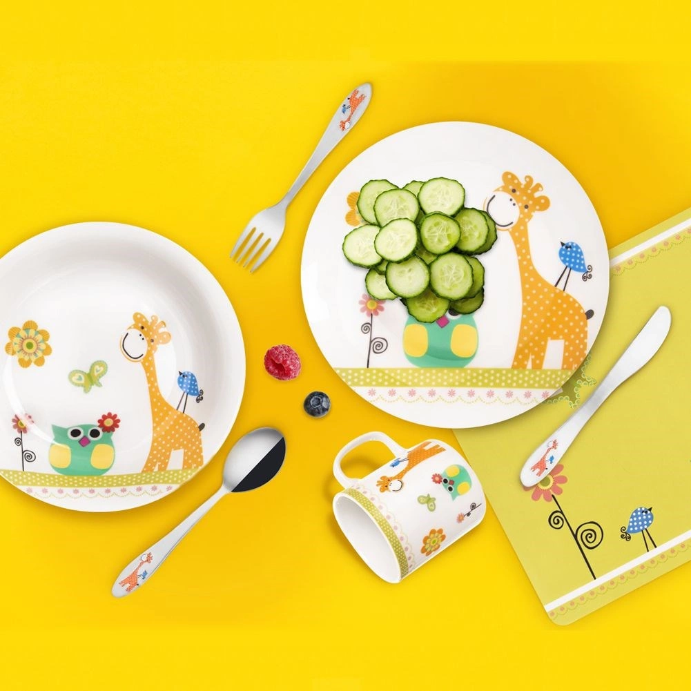 Dopřejte svému dítěti radost z jídla s kvalitní porcelánovou sadou s veselými motivy žirafy, sovičky a dalších zvířátek. Nadčasově bílý porcelán s barevným potiskem podporuje samostatné stolování a zpříjemní snídaně, polévky i svačinky.