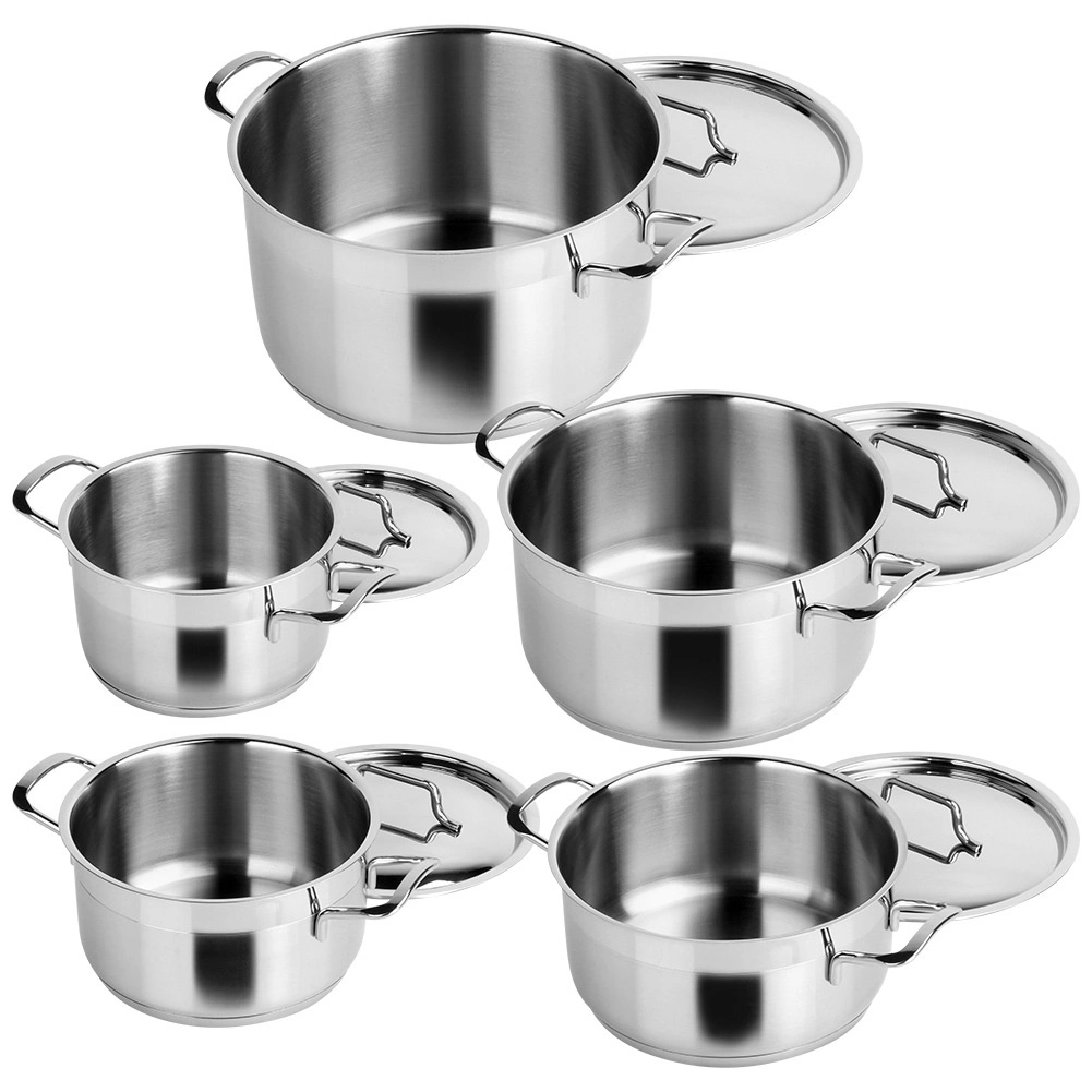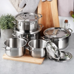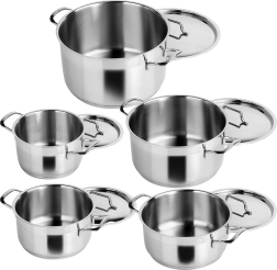 Sada ANETT nabízí 10 dílů – pět hrnců s přesně padnoucími nerezovými poklicemi – v nejoblíbenějších velikostech pro každodenní vaření, dušení i přípravu omáček a polévek. Kvalitní nerezová ocel 304 (18/10) s matným povrchem a elegantním lemem s leskem zaručuje odolnost, hygienu a nadčasový vzhled v každé kuchyni.