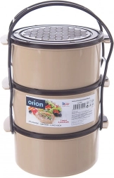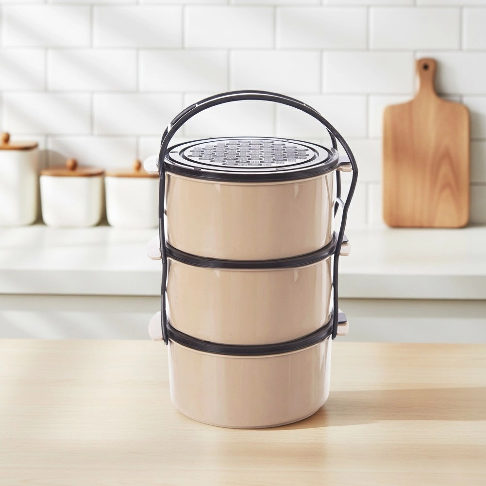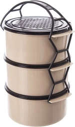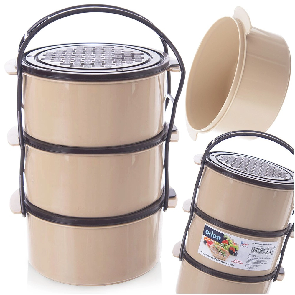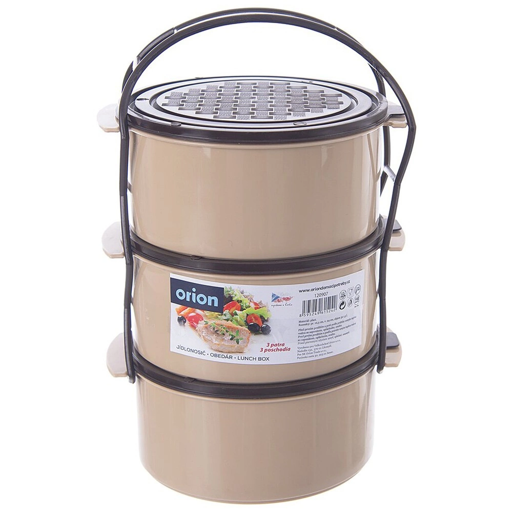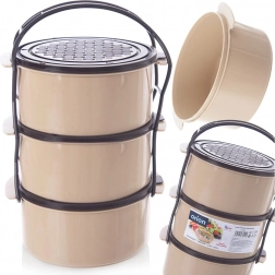 Praktická třípatrová jídlonosičová nádoba s objemem 3 × 1,5 l udrží vaše jídlo přehledně oddělené a bezpečně přenášené. Pevný rám s úchopovým madlem, samostatné víčka ke každé nádobě a odolné plastové provedení v béžovo–hnědé kombinaci zajišťují snadné používání doma i na cestách. Vhodná do myčky, lednice, mrazáku a do mikrovlnky bez víka.