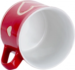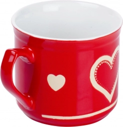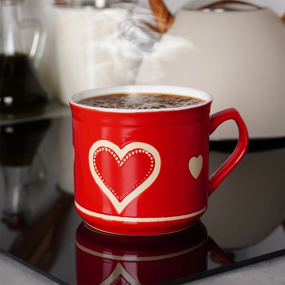 Velký keramický hrnek o objemu 650 ml v červené barvě se stylovým dekorom srdcí je skvělý na každodenní pití kávy či čaje. Má pohodlné ucho, ploché dno pro stabilitu a snadné ohřívání, je vhodný do mikrovlnky i myčky nádobí a potěší jako dekorativní prvek do kuchyně.
