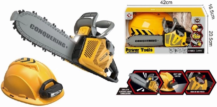 Zábavná sada pro malé dřevorubce obsahuje realistickou hračkovou motorovou pilu s světelnými a zvukovými efekty, dětskou ochrannou přilbu a svítilnu. Bezpečný a netoxický plast, věrný vzhled a snadné ovládání potěší každého malého kutila.