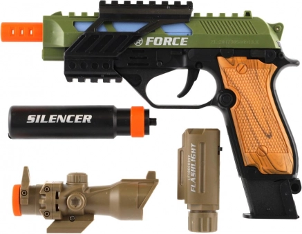 Realisticky vypadající plastová pistole pro malé nadšence do akčních her. Nabízí světelné efekty, zvukové efekty a praktické doplňky jako zaměřovač, svítilnu a tlumič. Funguje na baterie, které jsou součástí balení.
