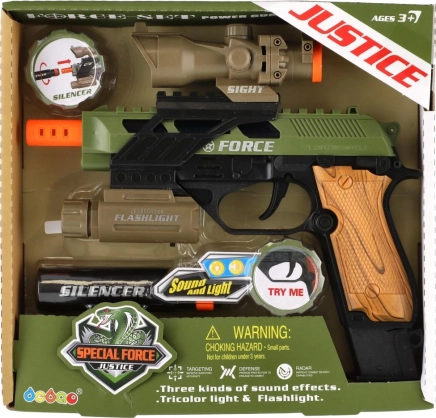 Tato plastová pistole potěší každého malého dobrodruha. Díky realistickému vzhledu a efektům světla a zvuku přináší více zábavy a akce do každé hry. Součástí je zaměřovač, světlo a tlumič, které podtrhují autentický dojem při hře.