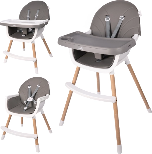 Praktická dětská jídelní židlička BITEO v elegantní šedé barvě nabízí bezpečné a pohodlné krmení každý den. Disponuje 5bodovým bezpečnostním pásem, odnímatelným a výškově nastavitelným dvojitým pultíkem, nastavitelnými nohami a protiskluzovými koncovkami. Stabilní ocelové nohy s dekorem dřeva doplňují moderní vzhled a spolehlivou stabilitu. Součástí balení je bryndák zdarma.