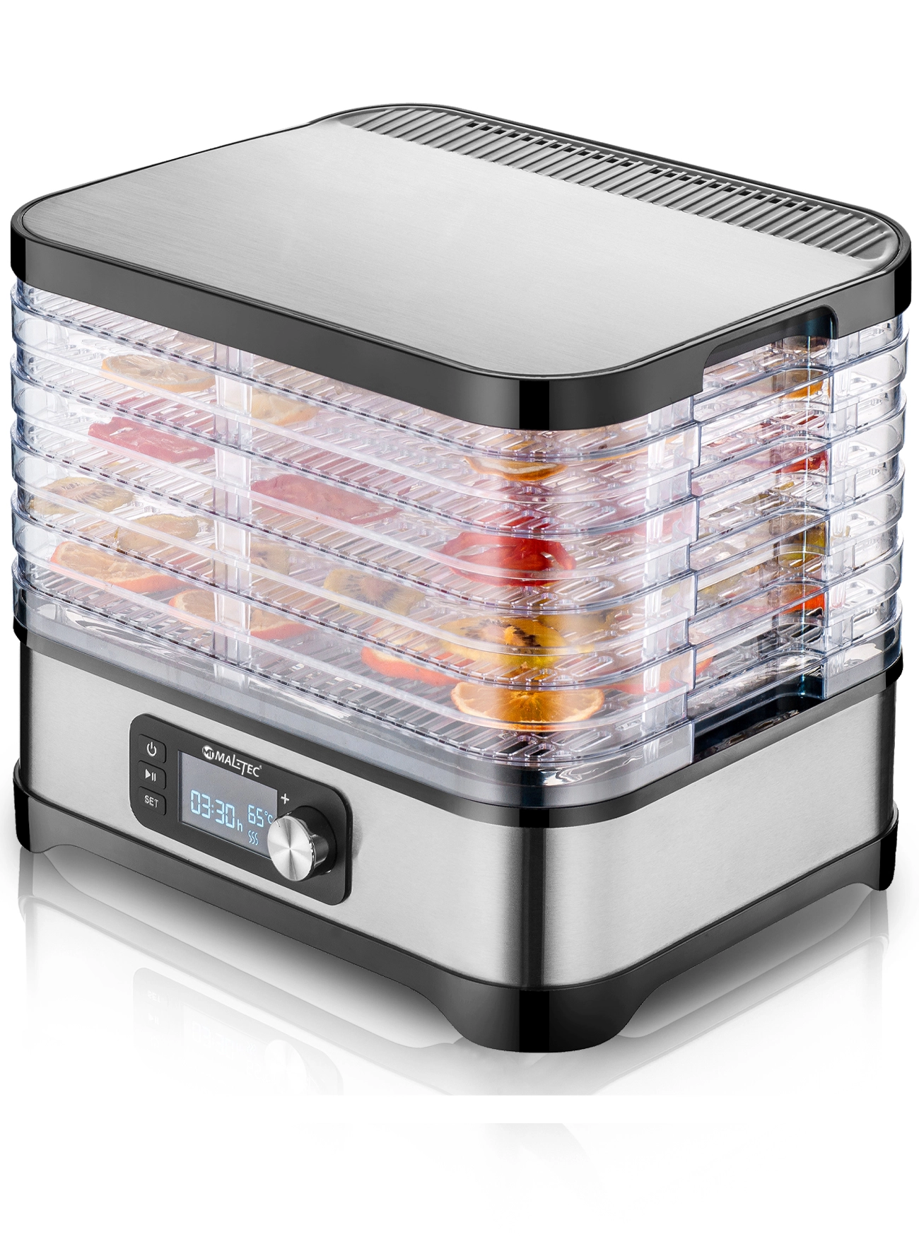 Sušička potravin MalTec PerfectDry je spolehlivý pomocník pro zdravé uchování ovoce, zeleniny, bylinek, hub či masa. Silný výkon 450 W a rovnoměrná cirkulace vzduchu zajišťují efektivní sušení, zatímco 8stupňová regulace teploty (35–70 °C) umožní přizpůsobit proces různým druhům surovin. Díky vestavěnému časovači a přehlednému LED displeji máte vše pod kontrolou.