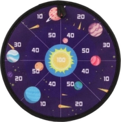 Jedna strana terče je navržena přitažlivými barvami a čísly pro tradiční hru, zatímco druhá strana přináší vesmírnou tematiku s obrázky planet. Děti mají možnost procvičovat matematiku při sčítání bodů podaných jednotlivými hody.
