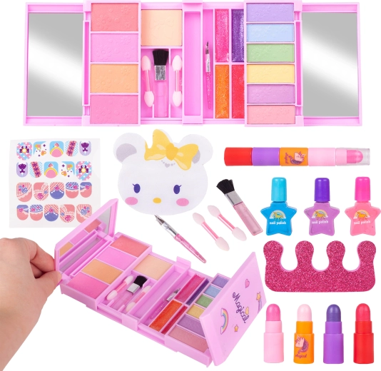 Roztomilá make-up sada ve tvaru koťátka potěší malé milovnice líčení. Obsahuje pestrý výběr líčidel pro kreativní hraní – od błyszczyków a pomádek po pudr, tvářenky a sypké stíny. Kompaktní paletka se dá rozložit a je ideální na cesty i domácí zábavu.