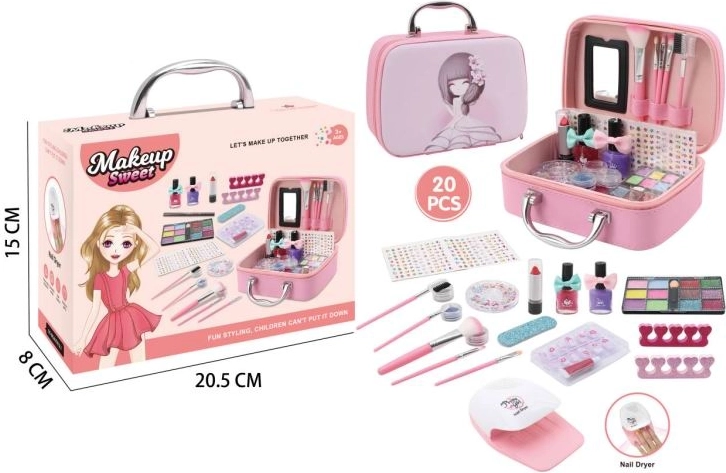 Tato kosmetická sada v elegantním kufříku je ideální pro začátečníky i nadšené tvůrce make-upu. Uzavřený kufřík je kompaktní a bezpečně ochrání obsah, po otevření nabídne přehledné uspořádání pro snadný výběr líčidel. Díky pohodlnému madlu se kufřík dobře nosí a je vhodný na cesty, do školy i na návštěvy.