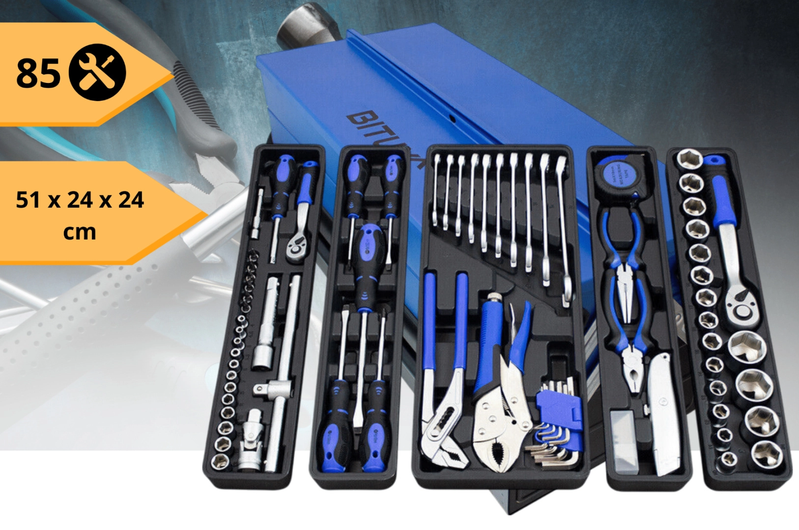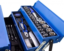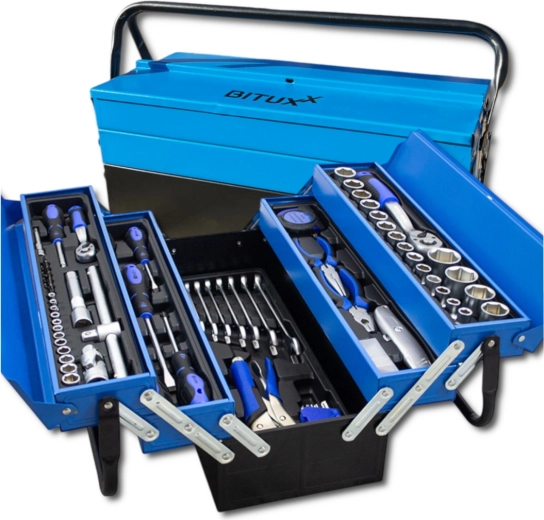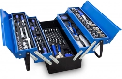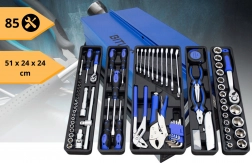 Praktická a přehledná sada nářadí s 85 díly v odolném kovovém rozkládacím kufru. Najdete v ní ráčny 1/4" a 1/2", bohatou sadu nástrčných hlavic, šroubováky, kombinované klíče, kleště i imbusy – vše uložené v organizovaných vložkách pro rychlý přístup. Ideální pro dílnu, garáž i domácí opravy.