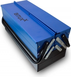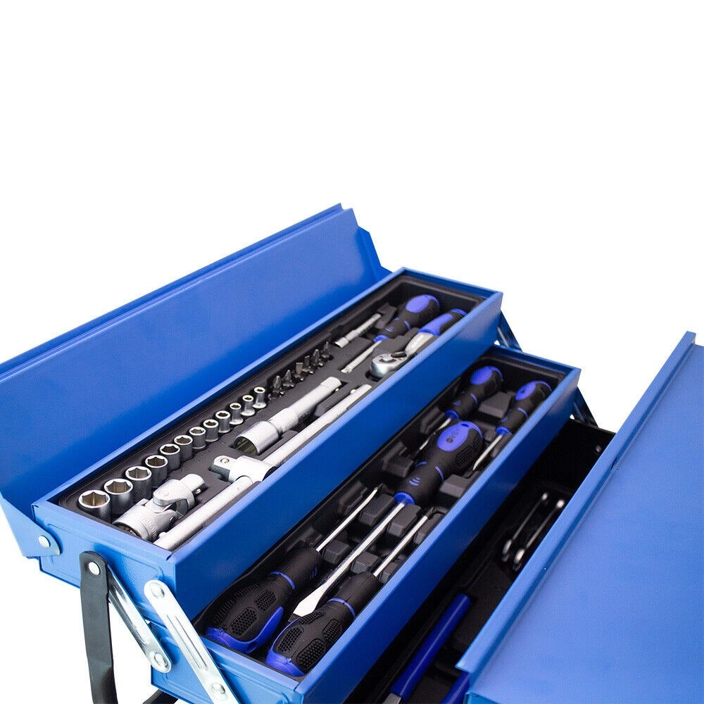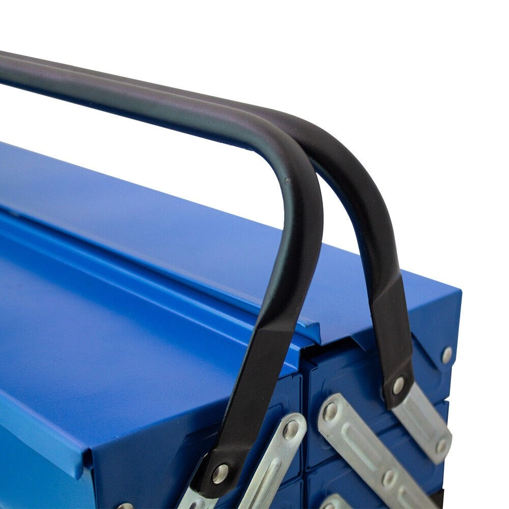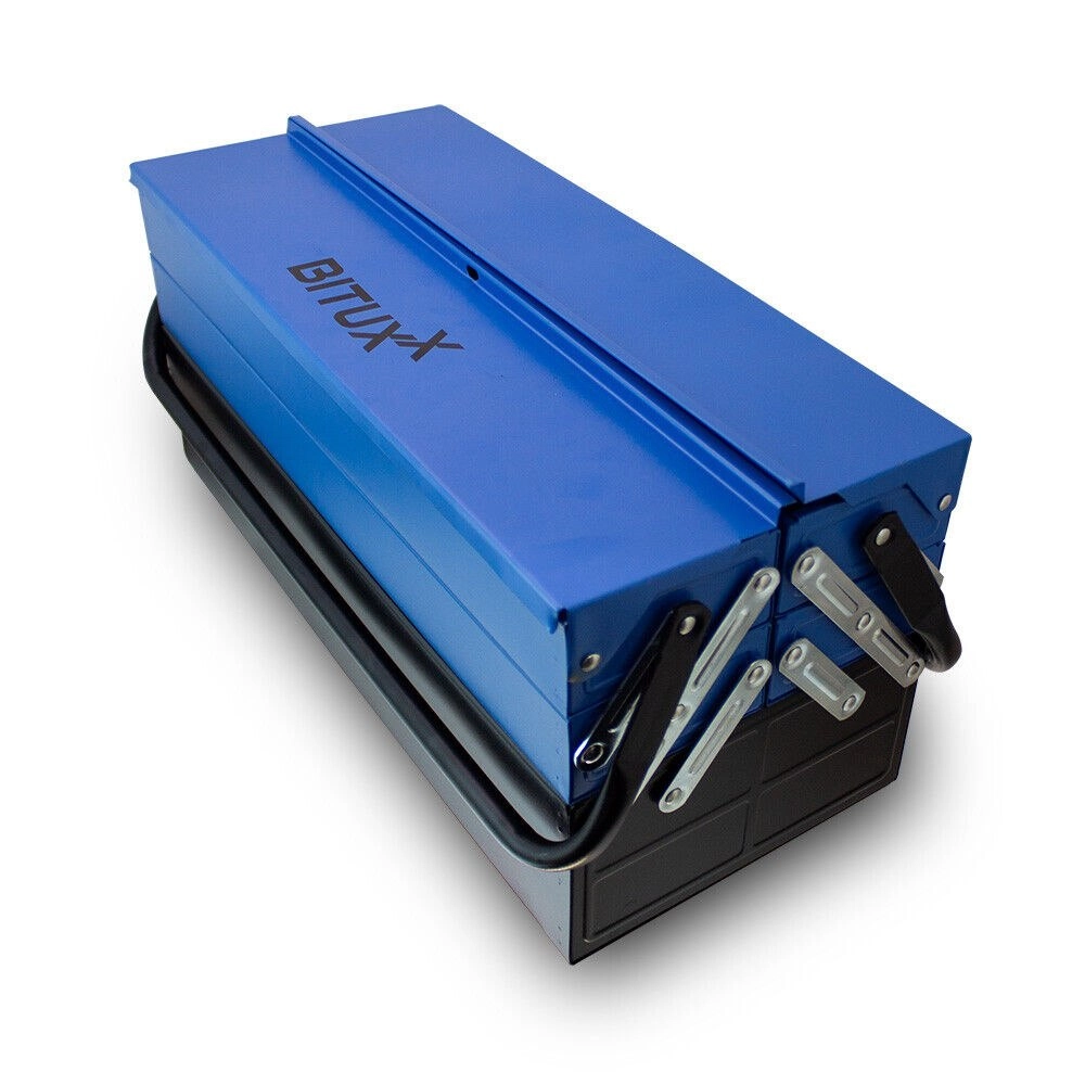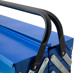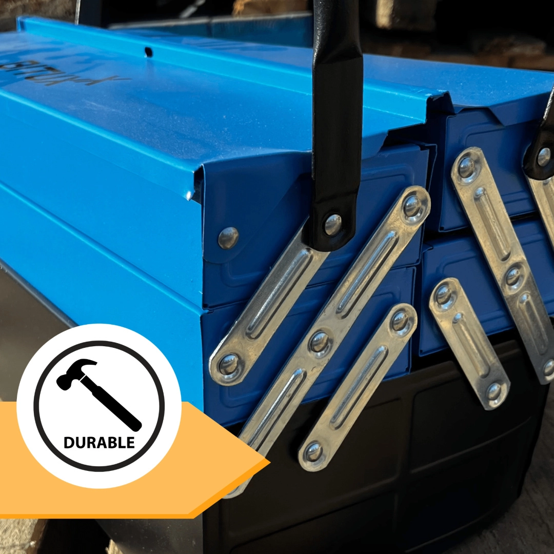 Pevná kovová skříňka s vícenásobně skládanými patry a robustními uchy nabízí trvanlivost, ochranu nářadí a pohodlnou mobilitu.