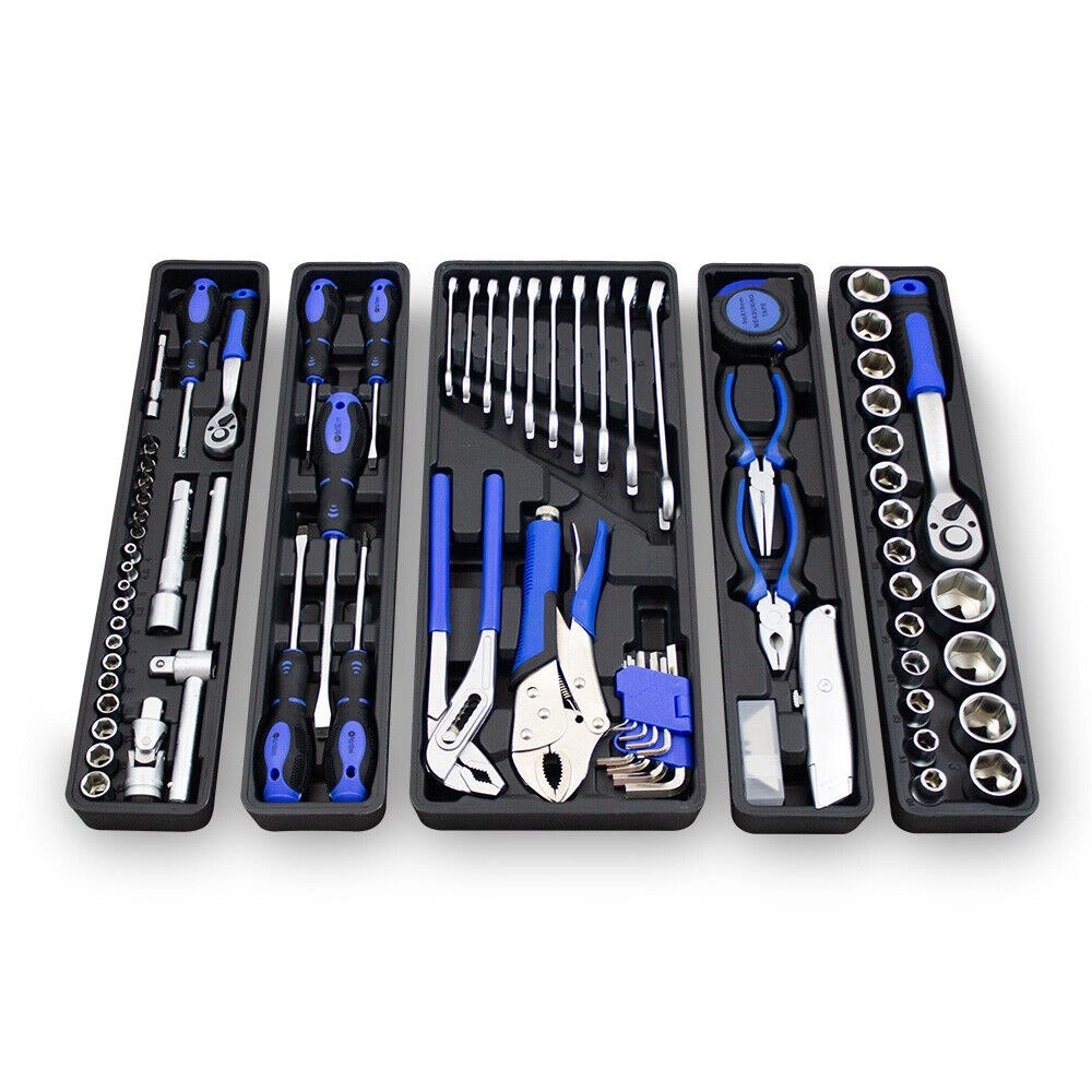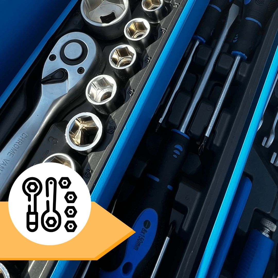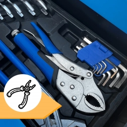 Sada zahrnuje kvalitní nástroje pro utahování a povolování šroubů a matic, přesné měření i řezání. Ráčny s jemným chodem (72 zubů) a široké spektrum hlavic pokrývají nejčastější rozměry, kleště a šroubováky doplňují výbavu pro každodenní použití v domácnosti i v autě.