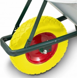 Plné poliuretanové (PU) kolo se jehličkovým ložiskem nevyžaduje huštění, je odolné proti defektům a zajišťuje plynulý a stabilní pohyb v terénu. Dlouhé ergonomické rukojeti usnadňují manipulaci a snižují únavu při práci.