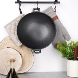 Univerzální litinový wok o průměru 30 cm s dvěma úchyty je ideální pro rychlé restování, prudké smažení i pečení v troubě. Masivní litinová konstrukce skvěle akumuluje a rovnoměrně rozvádí teplo, takže dosáhnete perfektní křupavosti a šťavnatosti. Vhodný na plyn, elektřinu, sklokeramiku, halogen i indukci.
