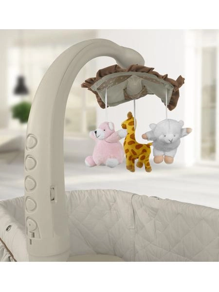Integrovaný kolotoč s plyšovými zvířátky nabízí melodie, noční lampičku s regulací jasu a funkci vibrací pro rychlé usínání. Ovládání je snadné i na dálku díky přiloženému dálkovému ovladači.