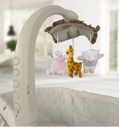 Integrovaný kolotoč s plyšovými hračkami nabízí melodie, noční lampičku a jemné vibrace. Hlasitost i intenzitu světla snadno nastavíte, nebo vše ovládnete dálkovým ovladačem.