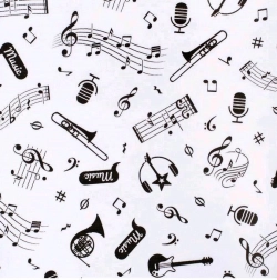 • Stylový hudební potisk – notičky a hudební nástroje, nápis „Music“.