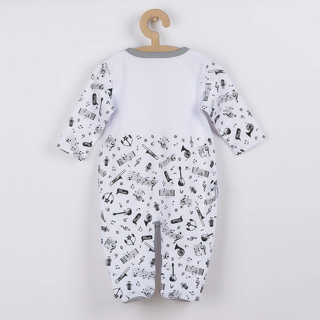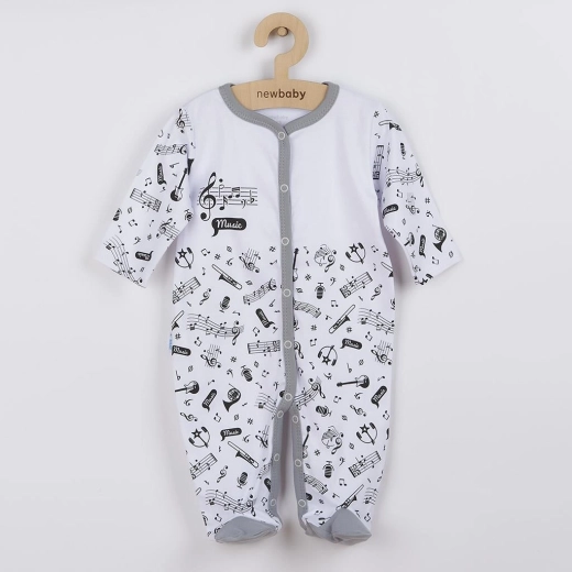 Pohodlný a roztomilý kojenecký overal New Baby Music z měkké 100% bavlny potěší jemným materiálem a hravým hudebním potiskem. Praktické zapínání na cvočky po celé délce včetně mezi nožičkami usnadní převlékání i přebalování. Univerzální design je vhodný pro kluky i holčičky a zajistí miminku celodenní pohodlí.