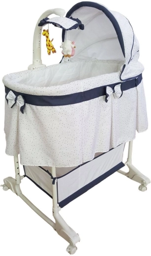 Integrovaný kolotoč s plyšovými zvířátky a elektronický modul s vibracemi, melodiemi a nočním osvětlením pomáhají miminko zklidnit. Vše pohodlně nastavíte pomocí dálkového ovládání, aniž byste rušili odpočinek dítěte. Součástí je měkká matrace a spodní koš na pleny a drobnosti, takže máte vše po ruce.