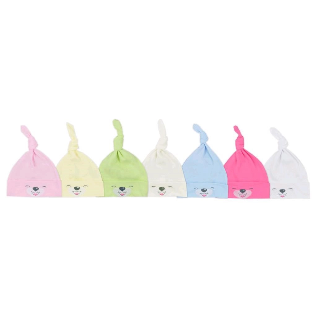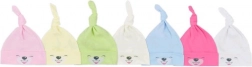 Roztomilá kojenecká čepička z 100% bavlny s motivem usměvavých tvářiček a roztomilým uzlíkem na vrchu. Má široký, netlačící lem, je měkká, příjemná na dotek a ideální pro citlivou pokožku miminka.