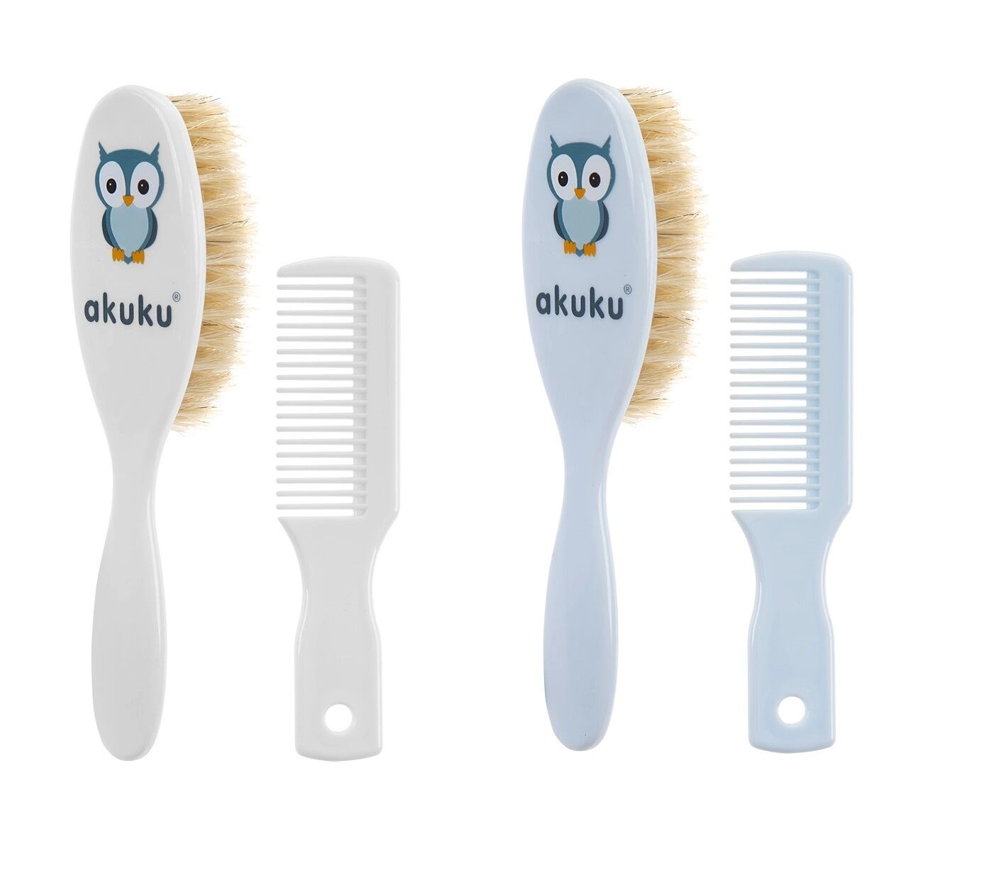 Jemný set pro každodenní péči o dětské vlásky: kartáček s přírodním vlasem a hřebínek v designu s motivem sovy. Šetrný k citlivé pokožce hlavy, bez BPA, vhodný od narození.