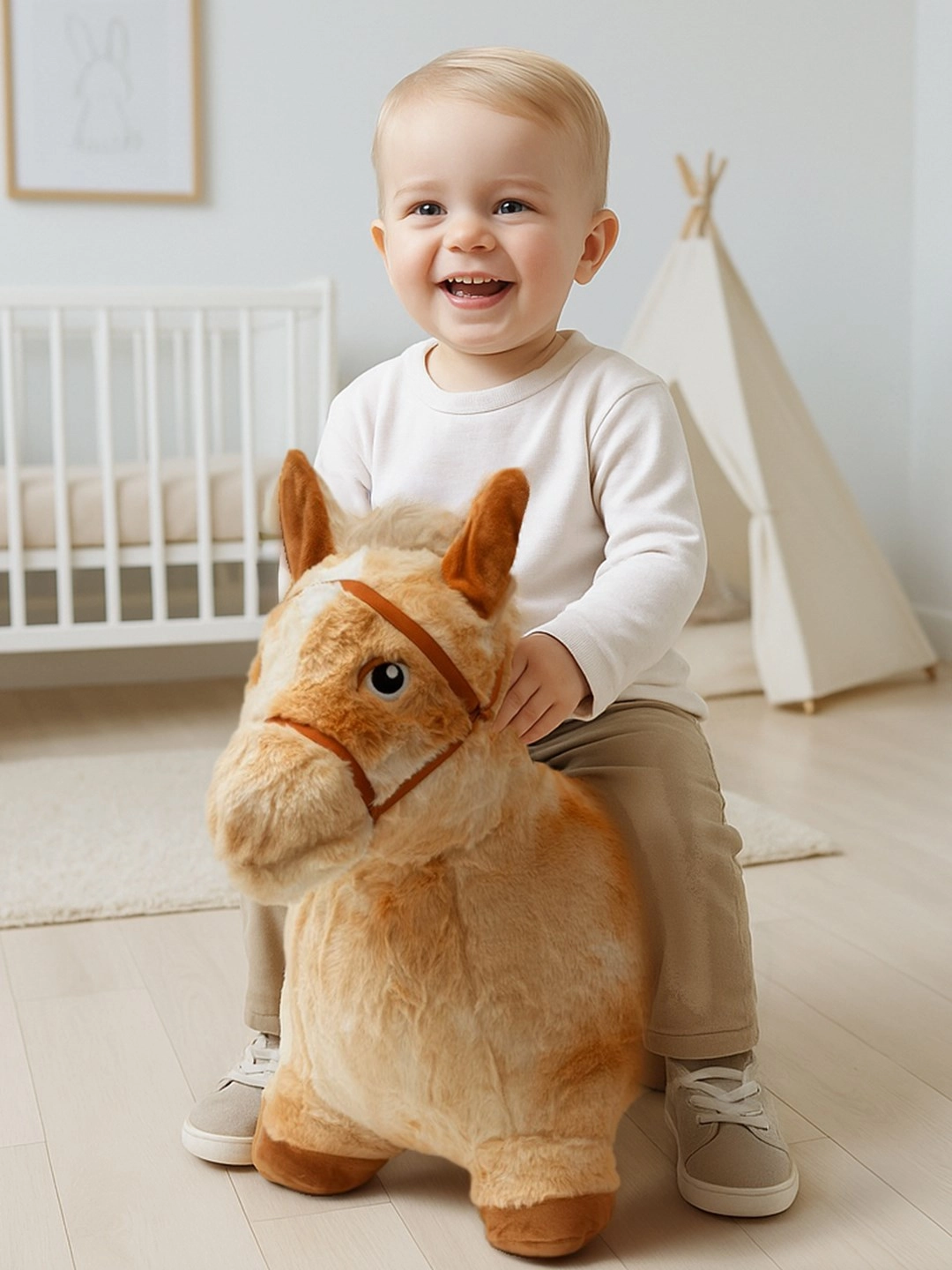Plyšový skákací koník PLAYTO spojuje zábavu, pohyb a bezpečí. Nafukovací tělo je obalené jemným, příjemným plyšem, který zajišťuje komfortní úchop a stabilitu při hraní. Po stisknutí uší koník vydává věrné zvuky, které podněcují představivost a prodlužují zábavu.