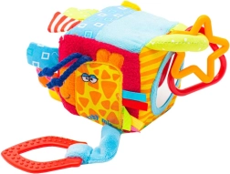 Barevná interaktivní kostka pro nejmenší nabízí zrcátko, chrastítka, šusticí a pískací části, textilní štítky a kroužky na kousání. Díky poutku ji snadno zavěsíte na kočárek či autosedačku. Podporuje rozvoj smyslů, úchop a koordinaci rukou a očí již od narození.