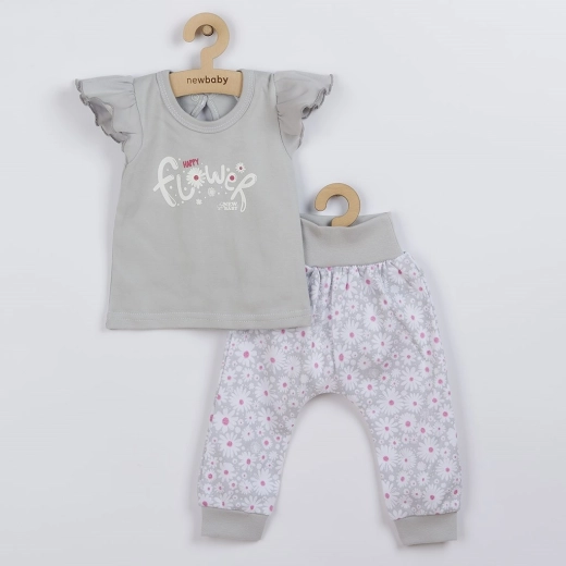 Tato kojenecká souprava New Baby Happy Flower je ideální volbou pro každodenní nošení i jako stylový dárek. Tričko se zapínáním na cvoček u krčku na zadní straně usnadňuje převlékání, volánkové rukávky dodávají dívčí šmrnc a potisk s nápisem Happy Flower vykouzlí úsměv.