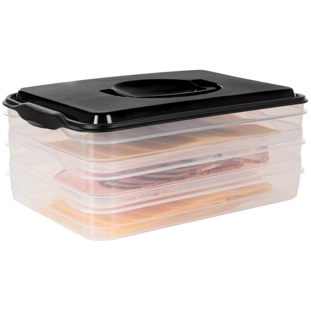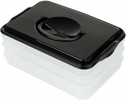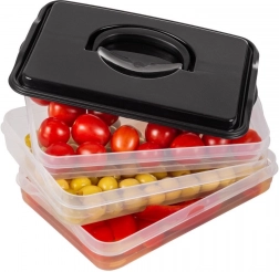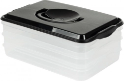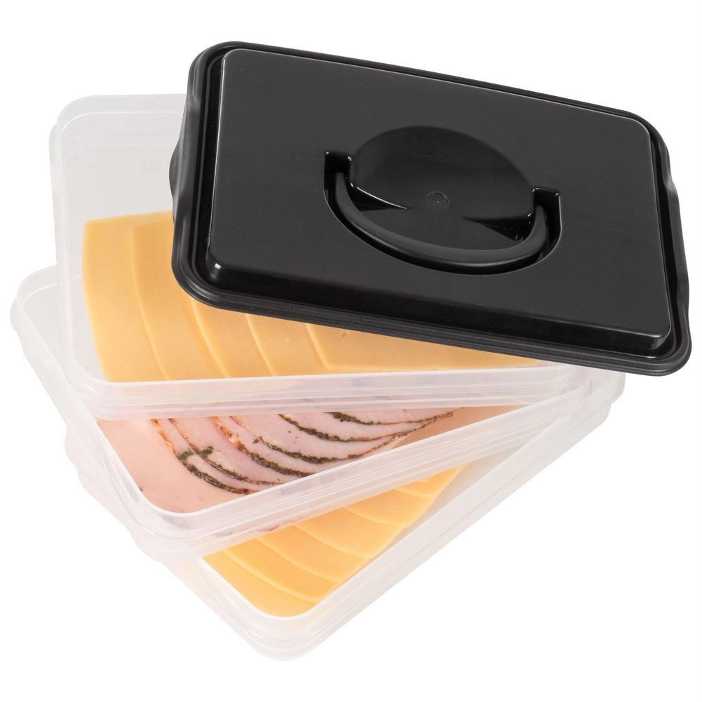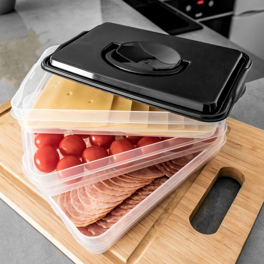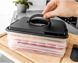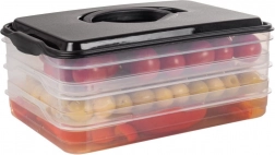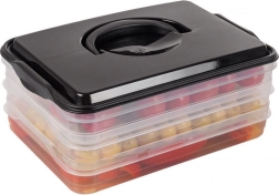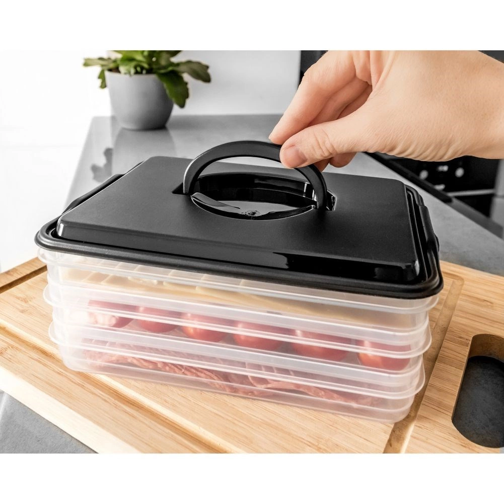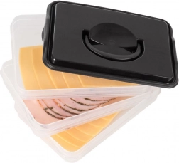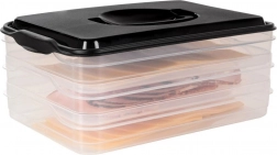 Tento inteligentní organizér potravin nabízí tři oddělitelné, průhledné patra pro pohodlné skladování plátkovaných sýrů, uzenin a drobných surovin bez míchání vůní. Kompaktní obdélníkový tvar skvěle sedí do polic lednice a bytelný černý kryt s úchytem zajišťuje snadnou manipulaci.