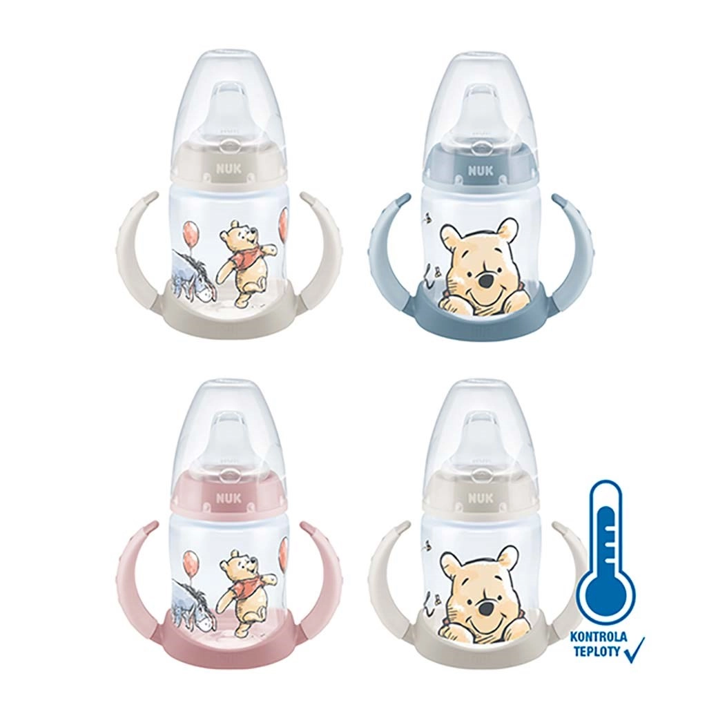 Láhev na učení NUK First Choice s motivem MEDVÍDEK PÚ je navržena pro pohodlný a bezpečný trénink pití dětí od 6 do 18 měsíců. Teplotní indikátor na lahvi okamžitě informuje, zda je nápoj vhodný k podávání – když je obsah příliš horký, modrá barva se změní na bílou. Měkké silikonové nekapající pítko zamezuje vylévání a podporuje plynulý přechod od kojení či krmení k samostatnému pití.