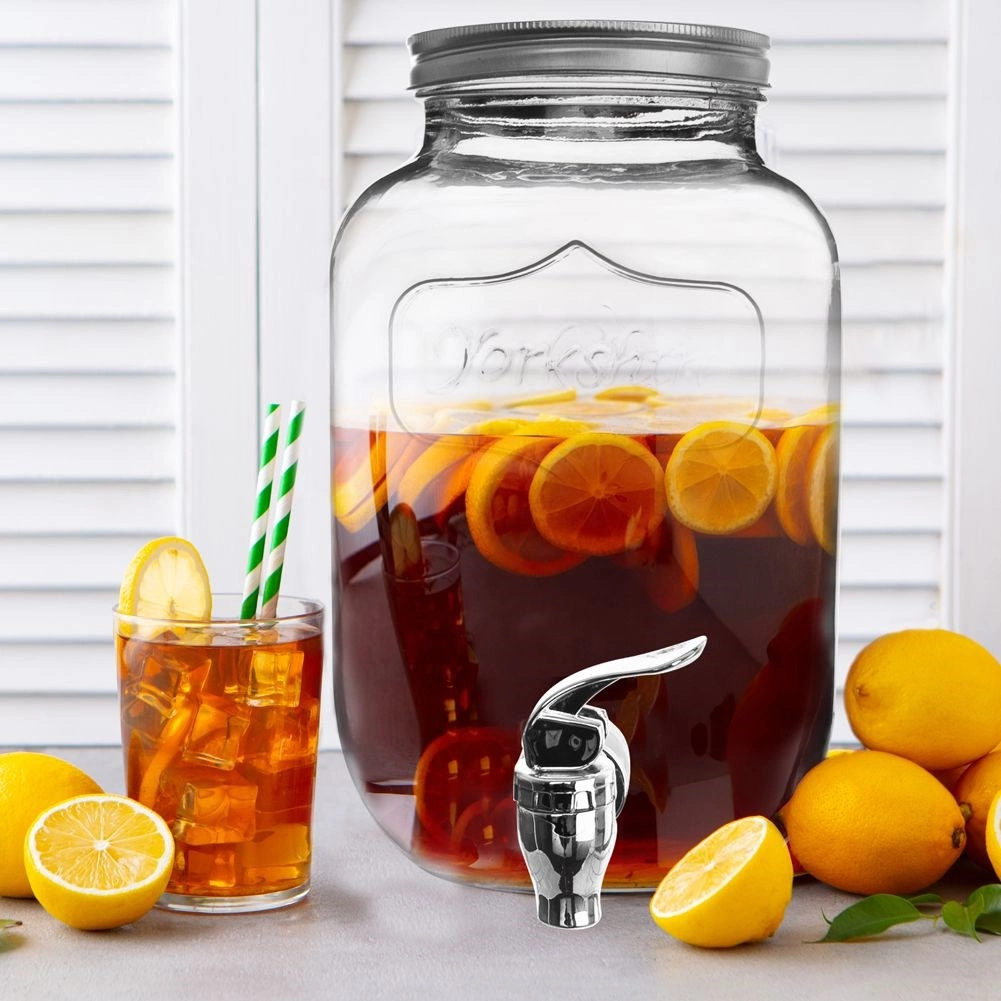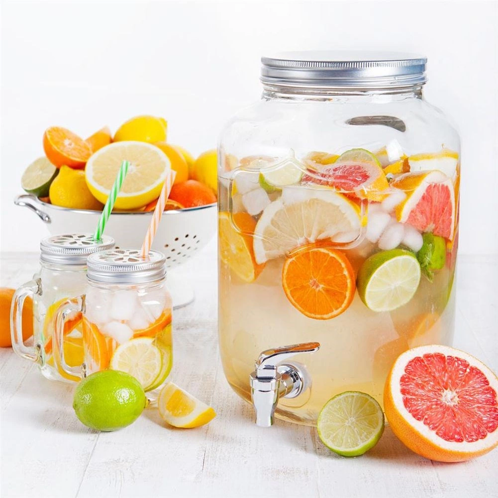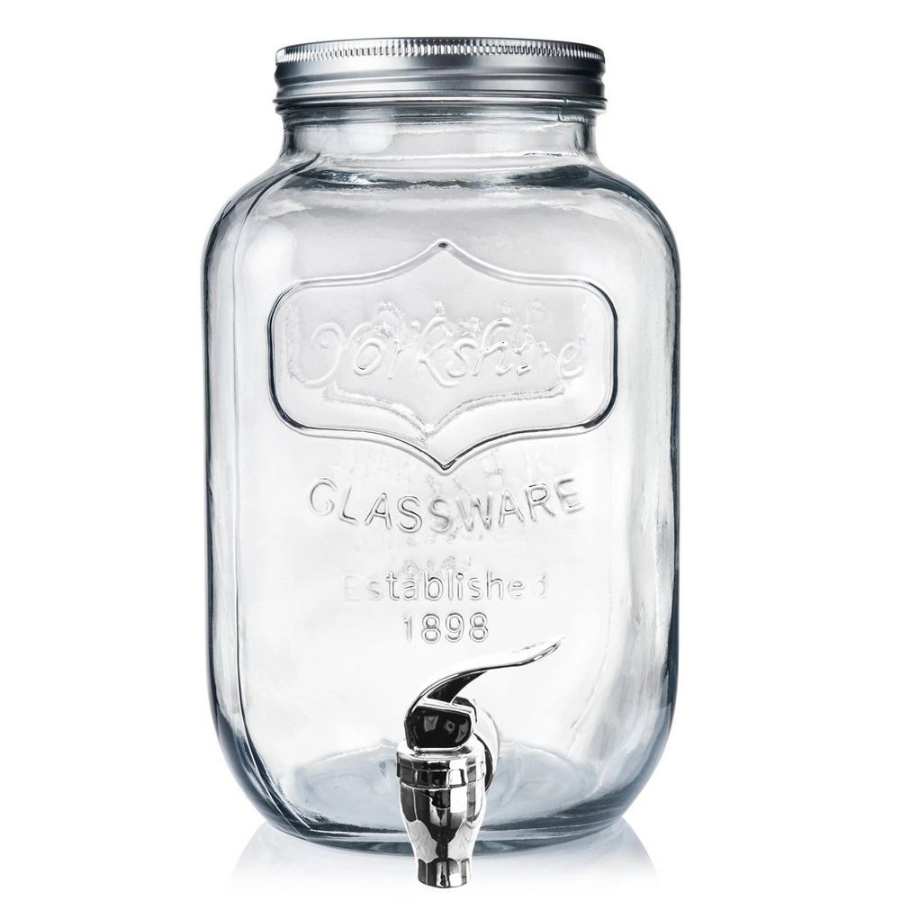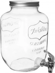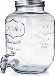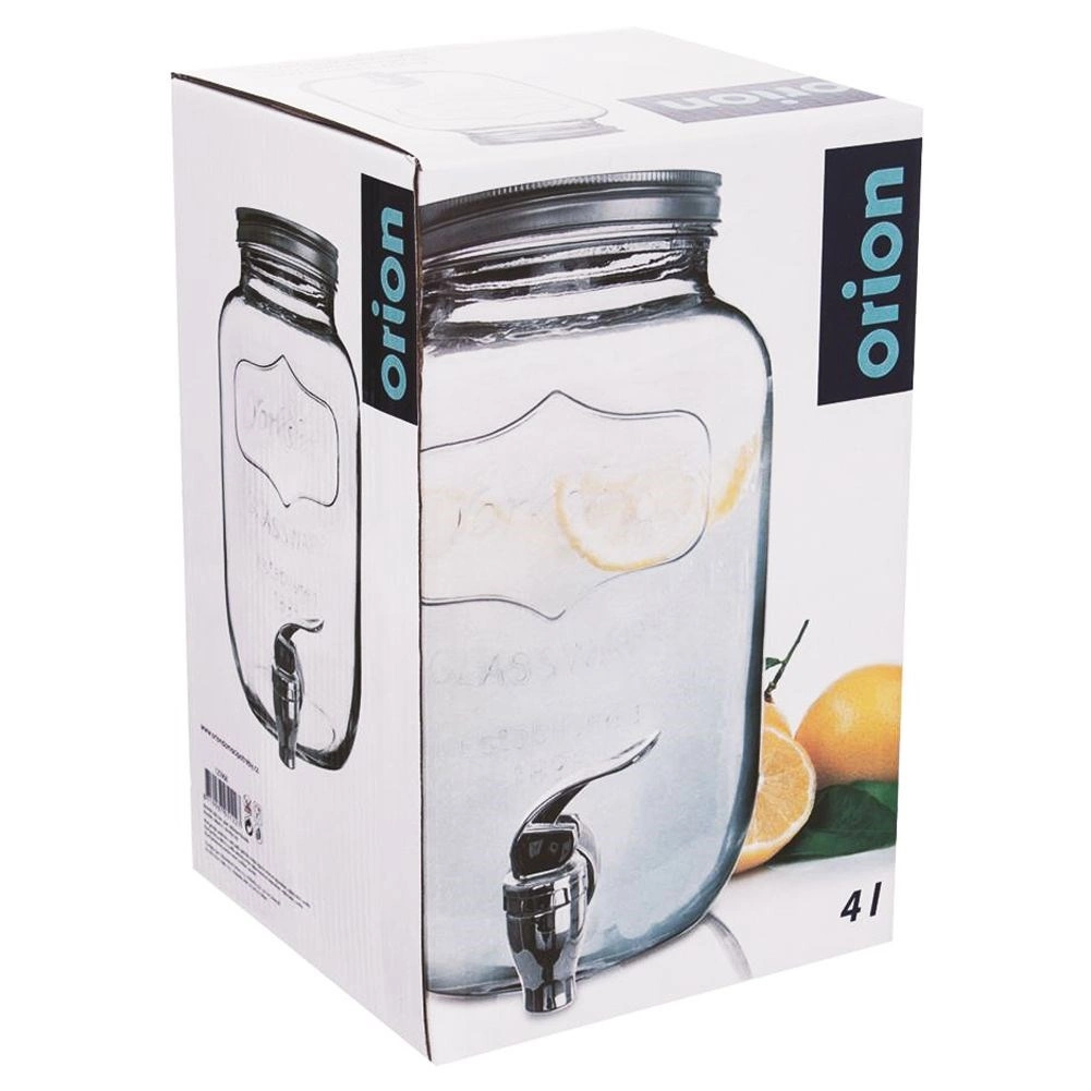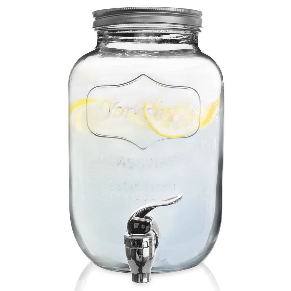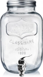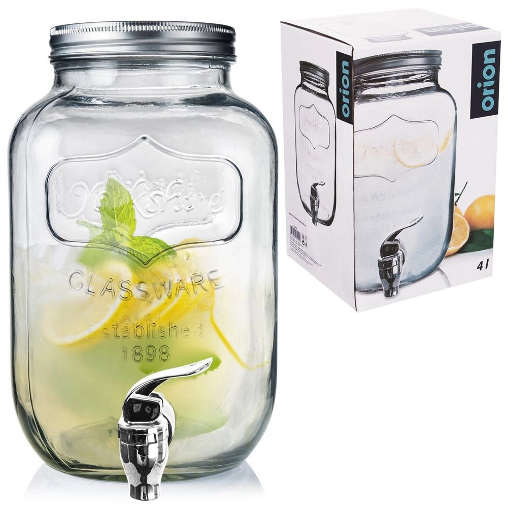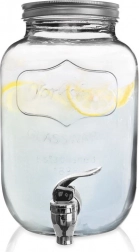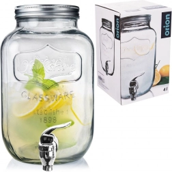Stylový skleněný dávkovač nápojů o objemu 4 l s kovovým víkem a praktickým kohoutkem pro pohodlné čepování. Ideální pro limonádu, ovocné vody, punč či iced tea. Má široké hrdlo pro snadné plnění a čištění, bezpečné materiály vhodné pro styk s potravinami a uzavíratelné víko, které chrání nápoj před hmyzem.