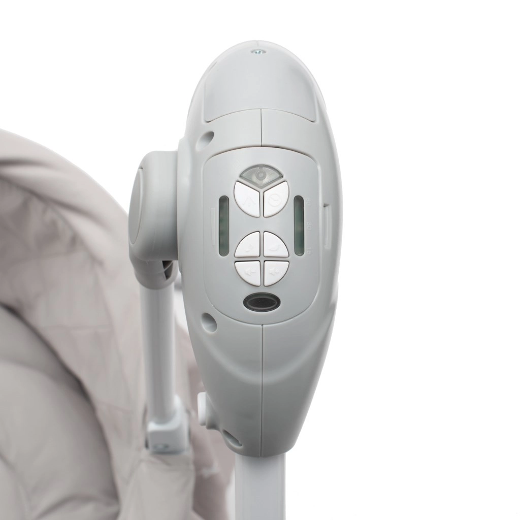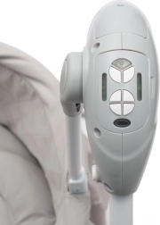 Integrovaný panel nabízí 12 uklidňujících melodií a přírodní zvuky, které pomáhají miminko zklidnit. Praktický časovač na 15, 30 nebo 60 minut zajistí, že se kolébání samo zastaví. Odnímatelná stříška s jemnou síťovinou chrání před hmyzem a zajišťuje proudění vzduchu, zatímco měkké polstrování a bezpečné uchycení přinášejí vyšší komfort.