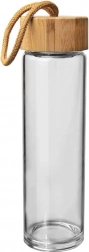 Elegantní skleněná láhev na vodu se sítkem o objemu 450 ml s přírodním bambusovým víčkem a textilní smyčkou pro pohodlné nošení. Odolné borosilikátové sklo zvládne studené i horké nápoje až do 100 °C. Nerezové sítko umožní infuzi ovoce a bylinek bez kousků v nápoji, silikonové těsnění zajistí 100% těsnost na cestách.