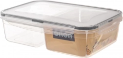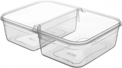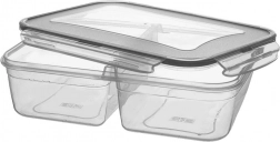 Praktický dělený box na potraviny o objemu 2 l s pevným víkem, čtyřmi klipy a silikonovým těsněním pro dokonalou těsnost. Díky dvěma odděleným přihrádkám udrží chutě a vůně oddělené, je bez BPA, vhodný do myčky, mikrovlnky (bez víka), lednice i mrazáku a odolá teplotám od -25 °C do +95 °C.