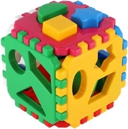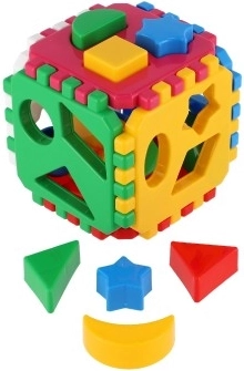 Obsah balení tvoří dílky pro složení kostky a sada tvarů k prostrkování odpovídajícími otvory. Odolné plastové provedení a kompaktní rozměry 12 × 12 × 12 cm z ní dělají skvělou hračku doma i na cestách.