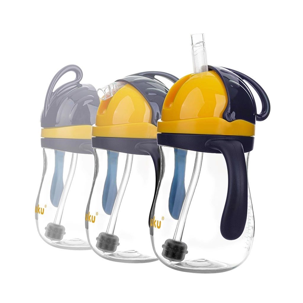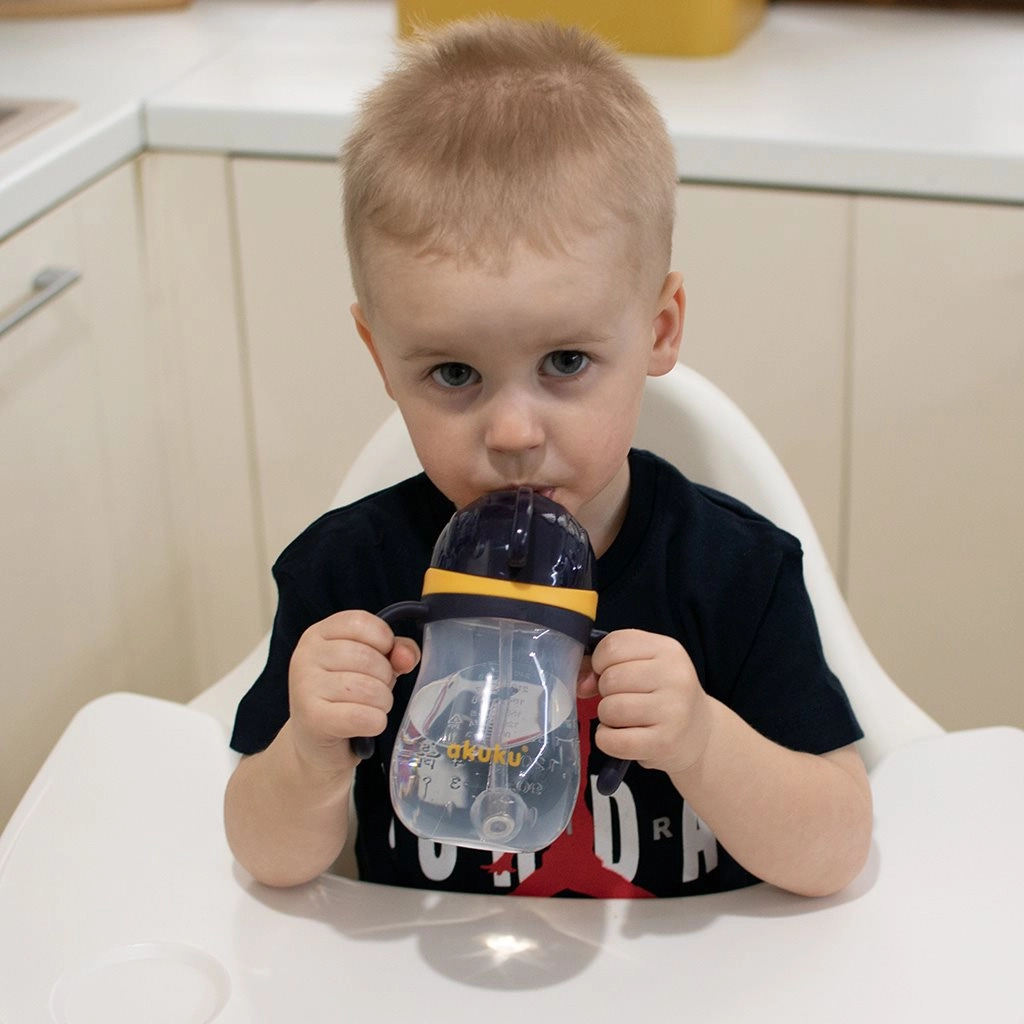 Dětská láhev Akuku se silikonovou slámkou se závažím je navržená pro samostatné pití bez rozlití. Závaží na konci slámky sleduje hladinu nápoje, takže dítě může pohodlně pít v sedě, v kočárku i s lahví vzhůru nohama. Flip víčko chrání slámku a zabraňuje znečištění.