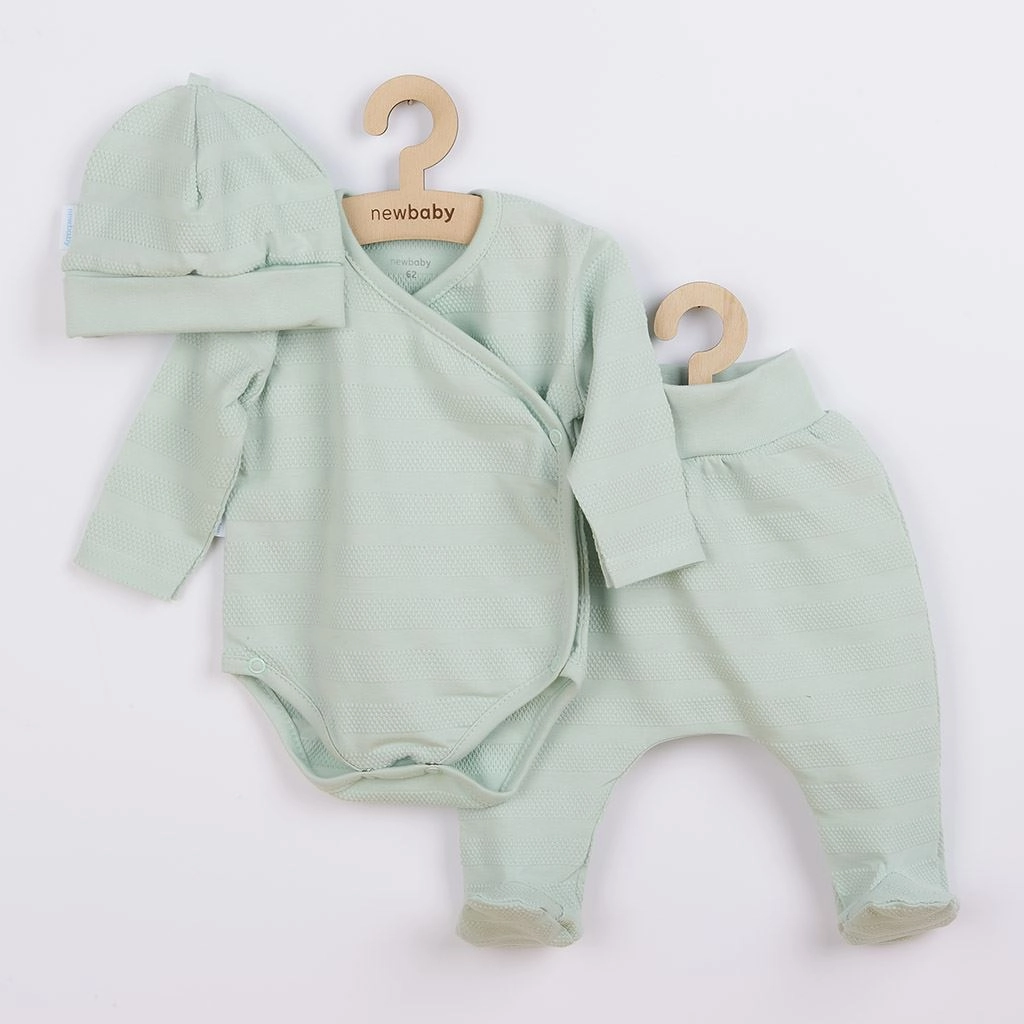 Tato mátová soupravička pro novorozence kombinuje komfort, bezpečí a jemný styl. Zavinovací body se zapínáním po celé délce usnadňuje oblékání i časté přebalování, polodupačky se širším pružným lemem netlačí na bříško a čepička s širším okrajem pohodlně drží na hlavičce. Celý set je z kvalitní, prodyšné a měkké 100% bavlny s atraktivní jemnou strukturou.