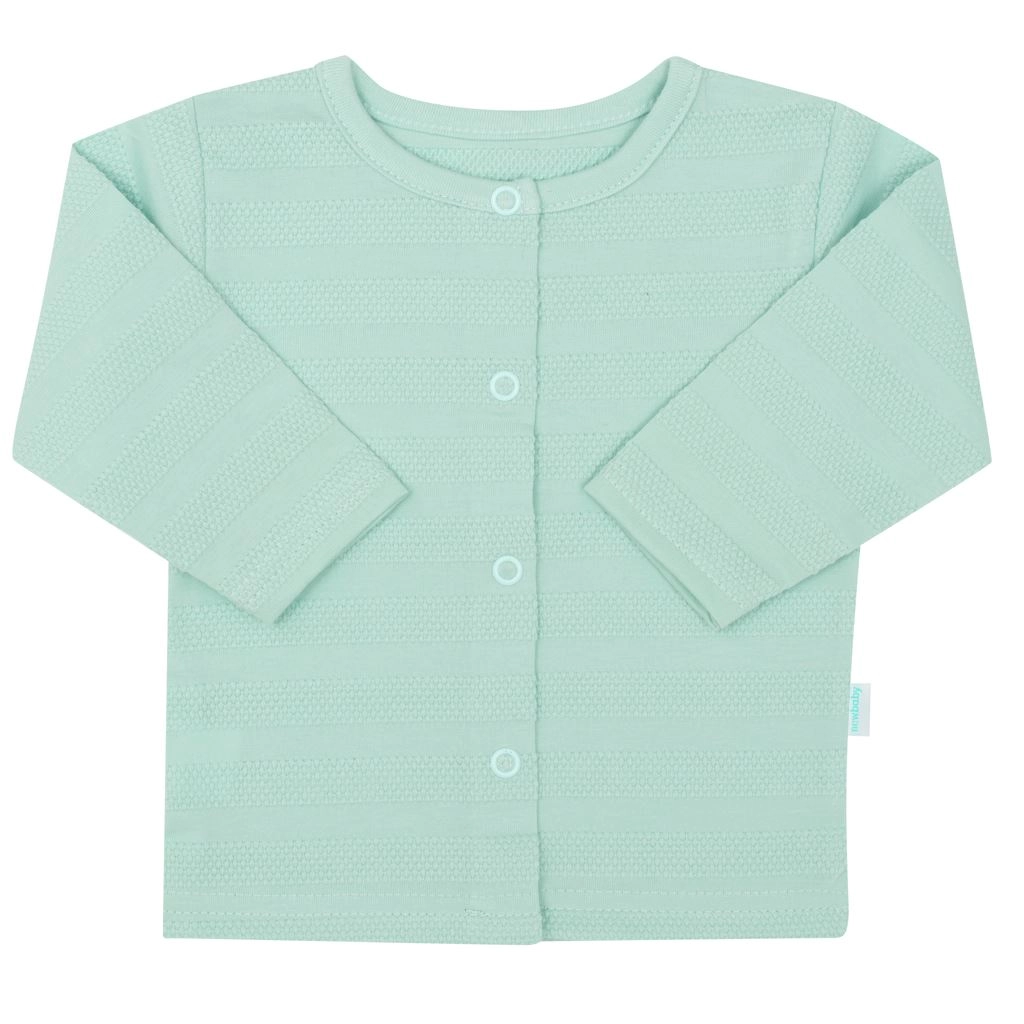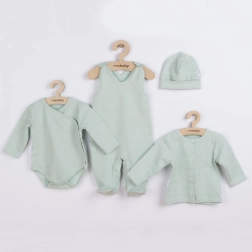 4dílný set zahrnuje body, dupačky, kabátek a čepičku v sladěném mátovém designu – připraveno v eko dárkové krabičce.