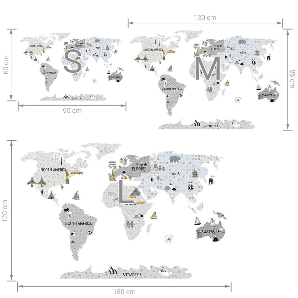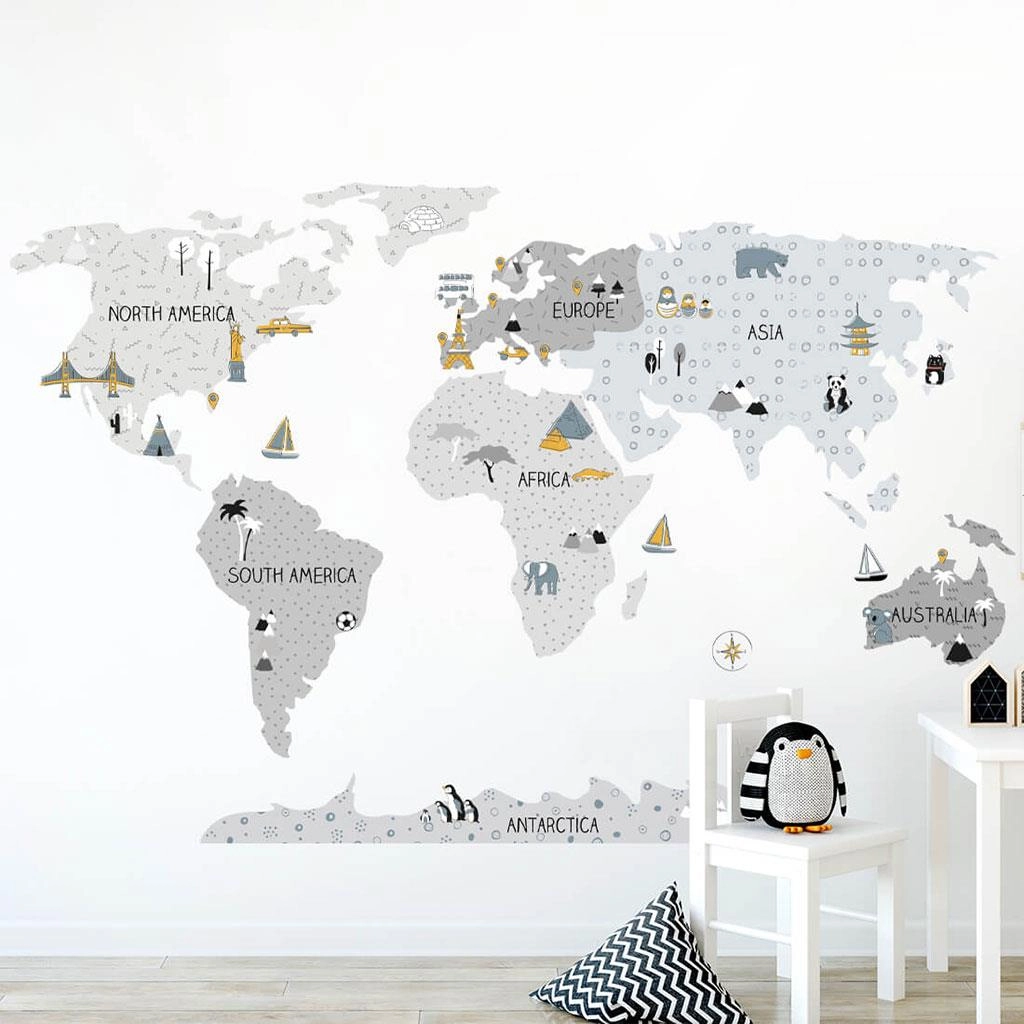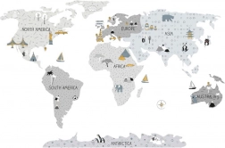 Tato designová mapa světa v šedé paletě zútulní každý dětský pokoj a zároveň podporuje učení formou hry. Děti si přirozeně osvojí názvy kontinentů, oceánů a světových stran a objeví památky i zajímavosti z různých koutů planety. Díky samostatně řezaným prvkům snadno přizpůsobíte rozestupy kontinentů prostoru na stěně.
