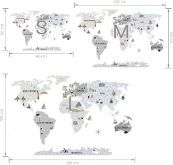Samolepka je opatřena speciálním matným laminátem, který zvyšuje odolnost proti poškrábání, usnadňuje přenos na stěnu a zajišťuje elegantní, neodleskující vzhled. Velikost výsledné kompozice se měří po nalepení – kontinenty lze rozmístit s ohledem na velikost místnosti.