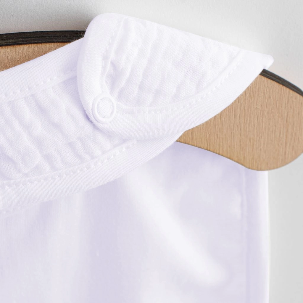 Mušelínový bryndák NEW BABY Elizabeth je ideální volbou pro každodenní použití. Lehká a vzdušná struktura mušelínu umožňuje materiálu „dýchat“, čímž snižuje riziko přehřátí a udržuje dítě v pohodlí. Praktické zapínání na cvočky ve dvou velikostech zaručuje perfektní přizpůsobení růstu miminka.