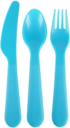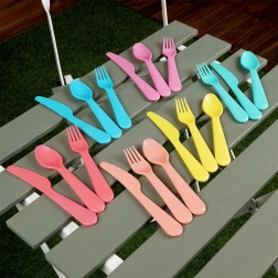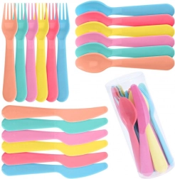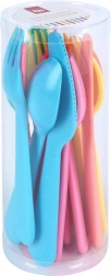 Barevný set plastových příborů pro 6 osob obsahuje 6× nůž, 6× vidličku a 6× lžíci. Lehký, vícekrát použitelný, s oblými, bezpečnými hranami a pohodlným úchopem. Ideální na pikniky, zahradní párty i cestování. Dodává se v praktickém boxu pro snadné uložení.