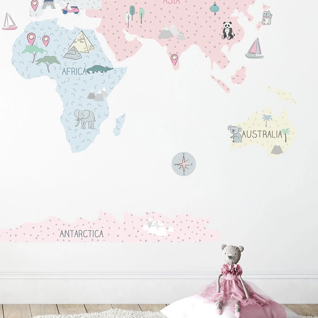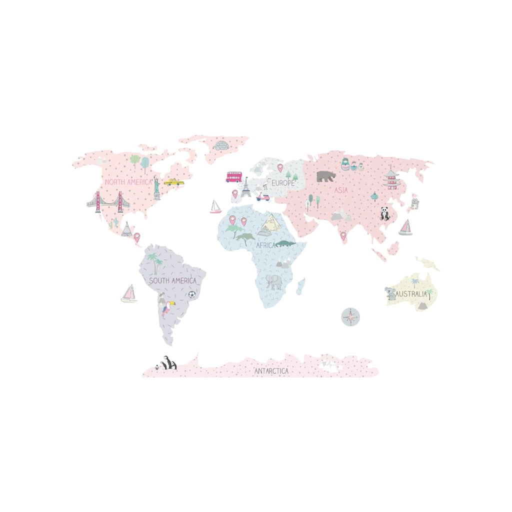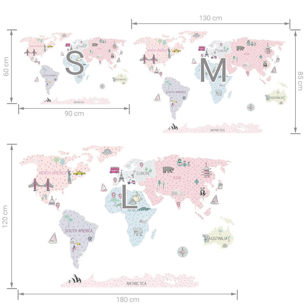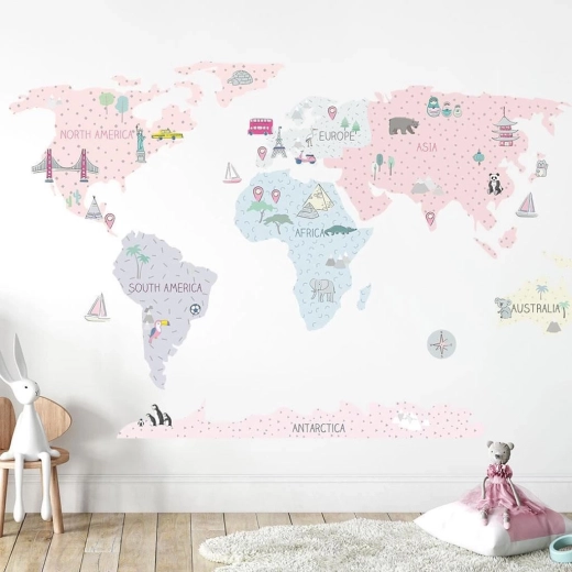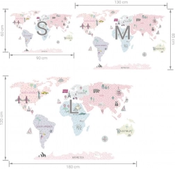 Objevte kouzlo učení hrou s krásnou samolepkou na zeď mapa světa L v růžových pastelových tónech. Tato dekorace v skandinávském stylu oživí každý dětský pokoj, přinese edukativní prvky (kontinenty, oceány, světové strany, památky) a díky matnému laminátu je odolná proti poškrábání a snadno se lepí. Každý prvek je vyříznut zvlášť pro snadnou aplikaci i ve větších prostorech.