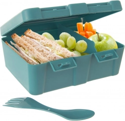 Praktický snídaňový box o objemu 1 l se dvěma přihrádkami a integrovaným příborem 2v1 (lžička a vidlička) je ideální na kanapky, saláty i svačiny. Pevné klipy zajistí bezpečné uzavření, vnitřní rozdělení brání míchání potravin a kvalitní materiál v matné tyrkysové barvě s potiskem mapy světa se zvířaty potěší děti i dospělé.