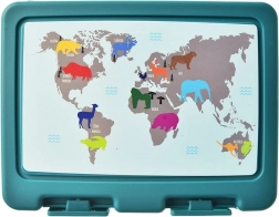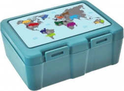 Dvě praktické přihrádky umožní oddělit hlavní jídlo a přílohy či ovoce. Silné boční klipy brání nechtěnému otevření a rozsypání obsahu, takže se můžete spolehnout na čistý batoh či kabelku. Atraktivní tyrkysový design s mapou světa a zvířaty motivuje k zdravějším svačinám a těší malé i velké.