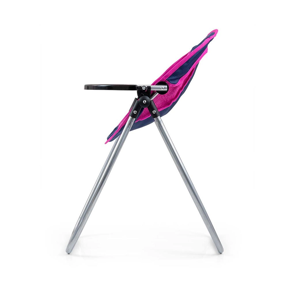 Lehká kovová konstrukce, pohodlné sedátko a kruhový tác pro bezpečné „krmení“ panenky. Židle se jednoduše složí pro úsporu místa a snadné cestování.