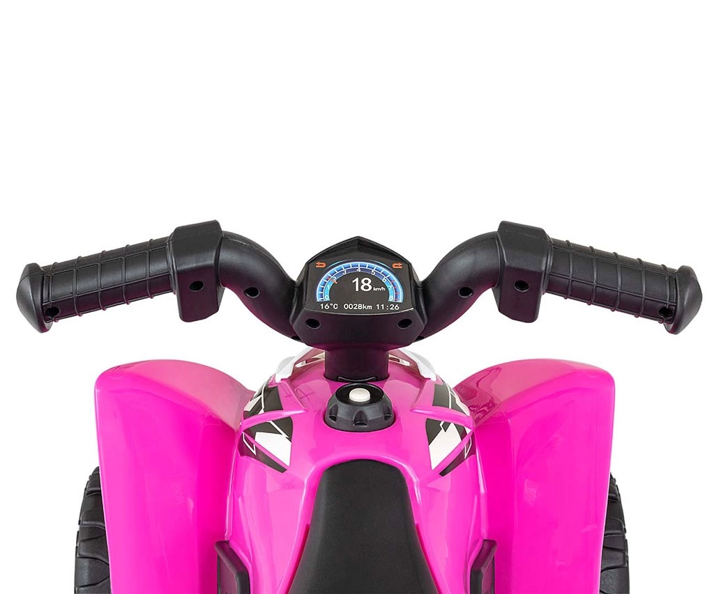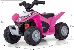 Tato elektrická dětská čtyřkolka v růžové barvě propojuje sportovní design a bezpečnou konstrukci. Díky licencovanému vzhledu HONDA a kvalitnímu zpracování z odolných materiálů si malí řidiči užijí realistickou zábavu. Po sešlápnutí pedálu se čtyřkolka rozjede a rozsvítí se přední světlo, což umocní zážitek z jízdy.