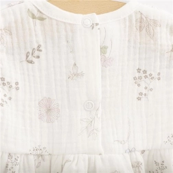 Mušelín z 100% bavlny je známý svou jemností, odolností a snadnou údržbou – s každým praním je ještě měkčí a příjemnější. Praktické zapínání na cvoček na zadní straně usnadňuje převlékání i u neposedných miminek.
